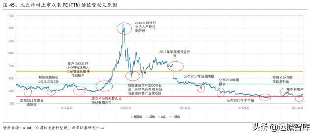 为应对经济下滑,中国央行多次降准降息,资金利率的下降带动公司估值上涨,2014年底,久立年产20000吨LNG输送大口径管件投产,公司产能和技术又上新台阶,也带动公司估值抬升,到2015年年中,公司PE估值最高达155倍。