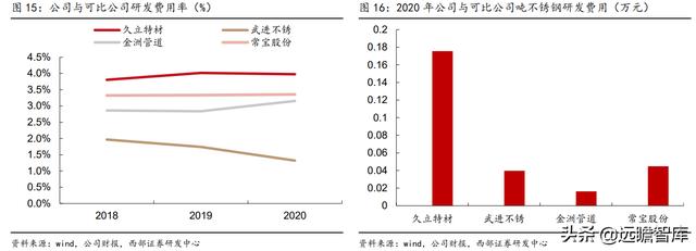2018-2020年,公司研发费率分别为3.81%/4.02%/3.98%,而同期武进不锈研发费率分别为 1.97%/1.74%/1.32%,金洲管道研发费率分别为2.86%/2.84%/3.16%。