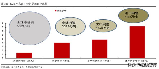 其中不锈钢无缝管均价4.8万元/吨,焊接管均价3.7万元/吨。2020年我国进口不锈钢管4.93 万吨,进口单价8.25万元/吨,出口不锈钢44.26万吨,出口单价为4.8万元/吨,进口单价是出口单价的1.72倍。