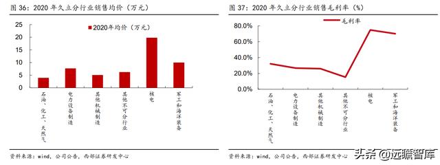 2020年公司核电领域毛利率74.75%,军工和海洋装备毛利率近70%,是公司综合毛利率水平2倍左右。公司2020年高端产品产量占比为8%,贡献公司2020年25%的净利润。