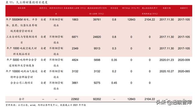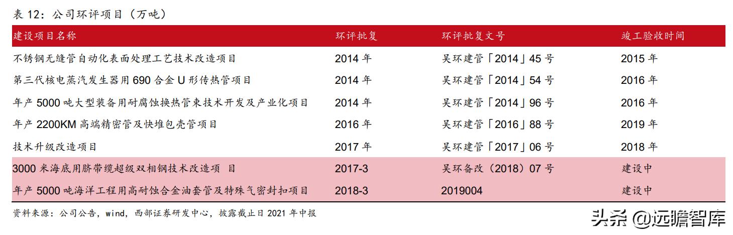截至到2021年6月份,公司环评3000米海底用脐带缆超级双相钢技术改造项目、年产5000 吨海洋工程用高耐蚀合金油套管及特殊气密封扣项目均在建设中,其中3000米海底用脐带缆超级双相钢技术改造项目涉及海洋军工领域,定位也比较高端。