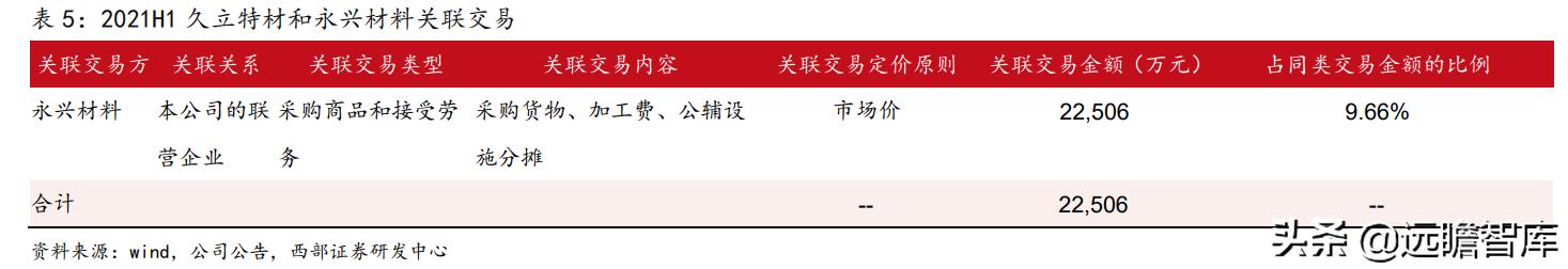 2019年12月之前久立特材连续增持永兴材料股份,目前持有永兴材料约9%股权。2019年全年公司与永兴材料关联交易金额2.30亿元,2020年上半年1.95亿元,2020年全年4亿元,2021年上半年2.25亿元,占同类交易金额的9.66%。