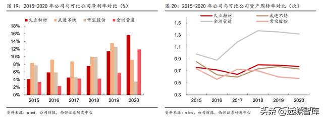 2018/2019/2020年,公司ROE(摊薄)分别为10%/15%/16%,而武进不锈 ROE 分别为 9%/13%/9%。其中 2018/2019 年公司资产周转率高于同行,2020 年公司净利率高于同行是公司 ROE 明显好于同行的主要原因。