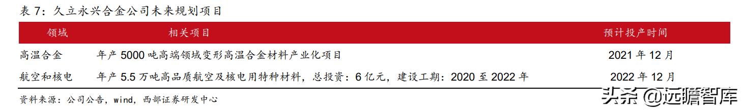 目前合金公司拥有特种合金材料约1万吨,锻造产品约5万吨,共计6万吨的年生产能力,随着(下表)规划项目的陆续投产,预计合金公司2021年产能达6.5万吨,2022年产能达12万吨。