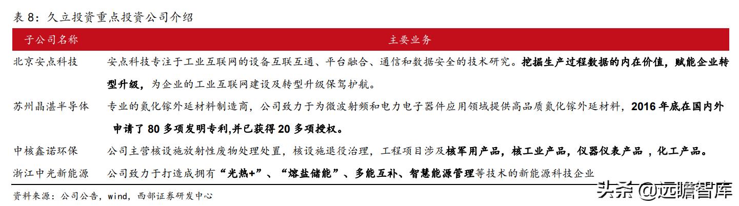 ③、子公司久立投资,是久立特材完全控股子公司,其投资涉及半导体(晶湛半导体)、环保(中核鑫诺环保)、安防(安点科技)、新能源科技(中光新能源)等诸多新兴领域和高科技板块。