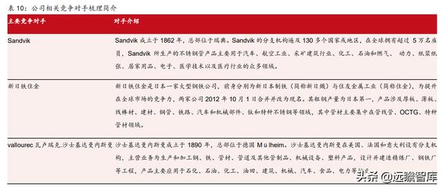 公司海外竞争对手主要为瑞典百年企业Sandvik、日本大型钢铁公司新日铁住金、德国vallourec 以及 Tubacex 集团。