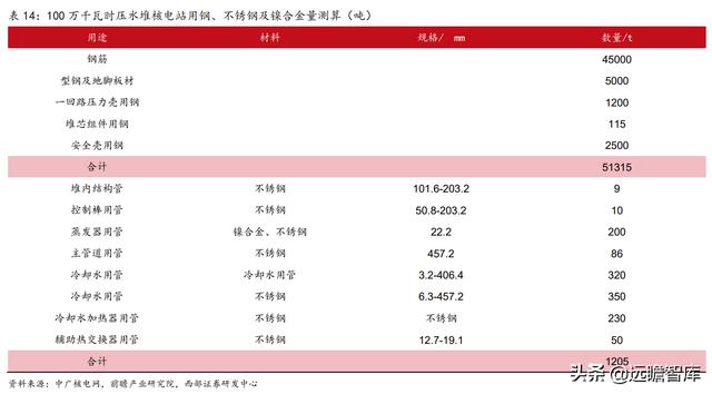 中广核电网的相关资料显示,发电能力100万千瓦的核电站消耗钢材5万吨以上,反应堆本体的压力壳、堆内构件、控制棒驱动机构、一回路系统的设备、构件、部件等关键部位用的钢和镍合金,其数量多达数1205吨,就压水堆和沸水堆而言,与一回路冷却剂接触的设备和构件,90%以上是用钢和镍合金制造,在钢和镍合金中不锈钢占80-90%,以下为核电站用不锈钢的具体情况。