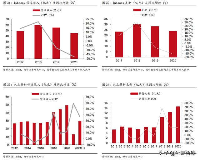 我们将Sandvik、Tubacex和久立特材营收和毛利进行对比:2020年在新冠疫情的影响下,全球经济下滑。Sandvik 2020年营收和毛利分别同比下滑5%和12%;Tubacex 2020年营收和毛利分别同比下滑18%和16%;而久立2020年营收和毛利分别同比增长11.68%和18.89%,这里面去除我国疫情管控较好、经济受影响较小的因素外,也和久立加大布局新兴成长赛道、抵御周期波动密切相关。
