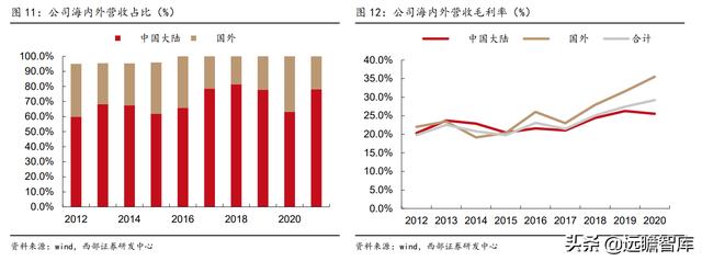 2018年~2020年,公司海外业务毛利率较国内业务毛利率分别高出3.5、5.31、9.98个百分点,且2020年海外营收占比升至36.94%。