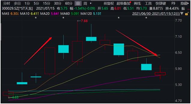 这份延期公告发布后,*ST天龙的股价应声下挫。7月14日,*ST天龙股价收盘暴跌近11%,7月15日收盘进一步下挫1.5%,最新市值缩水至11.5亿元。从日K线图看,7月1日至7月15日期间,*ST天龙的股价走出了明显的“过山车”走势。