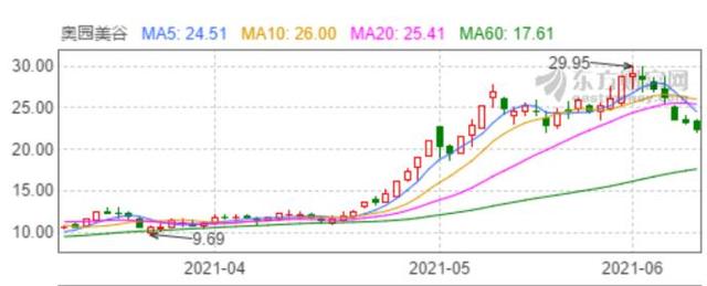 奥园美谷股价最近也开始\”熄火\”。今年6月以来,该股累计下滑近20%。截至6月9日,该股报收22.31元/股,市值174亿元。