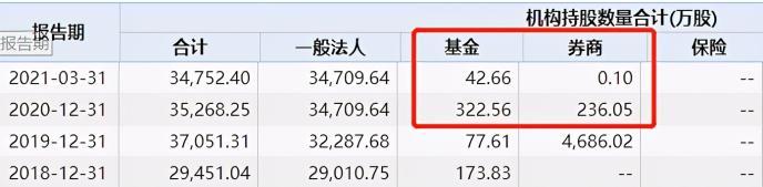 Wind数据统计,截至2021年一季度末,基金对公司的持股合计为42.66万股,相比2020年年末的322.56万股有所降低;券商持股则从236万股降至1000股。
