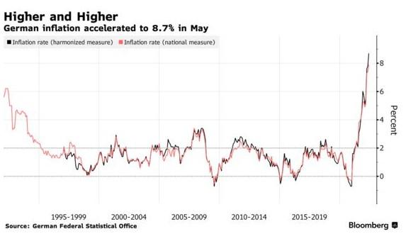 周一公布的数据显示,在能源和食品价格飙升的推动下,德国5月份消费者价格指数(CPI)较上年同期上涨8.7%。彭博社调查的分析师曾预计增长8.1%。