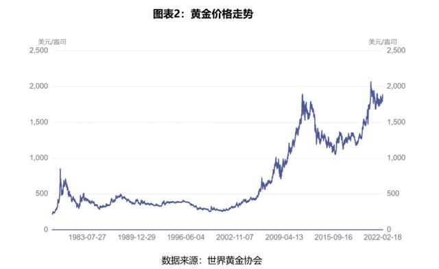 黄金价格走势来看,2001年以来,随着世界货币宽松周期到来,黄金价格快速上涨,2001年初的从267美元/盎司上涨至2010年的1700美元/盎司;2013年因印度及中国的珠宝需求下降且美国和欧洲的金币及金条投资大幅走低等原因,黄金价格快速下跌至2015年的1100美元/盎司左右;2019年出于对全球经济的担忧,多国加大黄金储备,叠加2020年疫情下的全球货币大宽松,黄金价格持续走高,随后进入平台期,后续有望再突破新高。