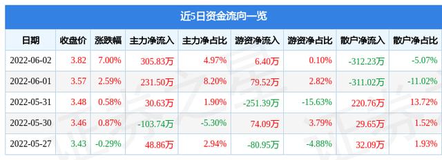 资金流向数据方面,6月2日主力资金净流入305.83万元,游资资金净流入6.4万元,散户资金净流出312.23万元。