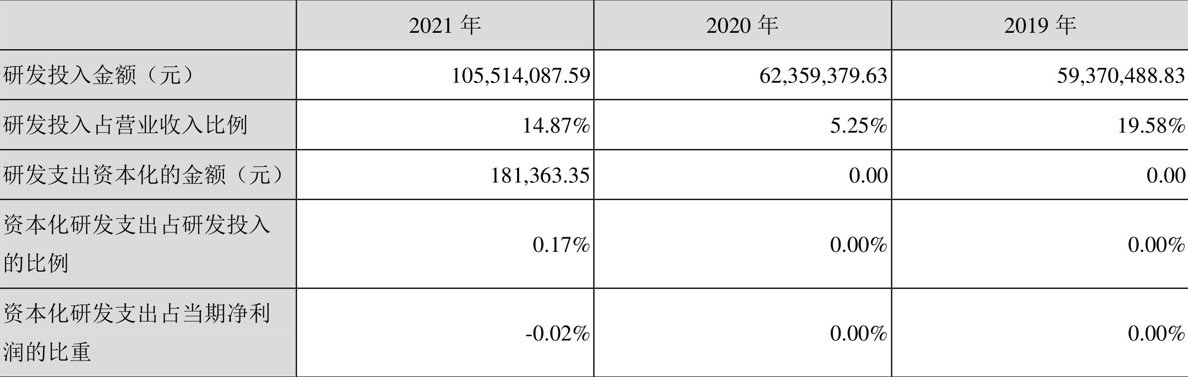 2021年全年,公司研发投入金额为1.06亿元,同比增长69.20%;研发投入占营业收入比例为14.87%,相比上年同期上升9.62个百分点。此外,公司全年研发投入资本化率为0.17%。