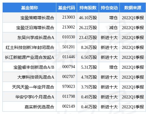 根据2022Q1季报基金重仓股数据,重仓该股的基金共13家,其中持有数量最多的基金为宝盈策略增长混合。宝盈策略增长混合目前规模为10.28亿元,最新净值0.8656(5月23日),较上一交易日下跌0.03%,近一年下跌8.33%。该基金现任基金经理为朱建明。朱建明在任的公募基金包括:宝盈睿丰创新混合A/B,管理时间为2017年1月5日至今,期间收益率为67.18%;宝盈泛沿海增长混合,管理时间为2020年2月4日至今,期间收益率为16.88%。