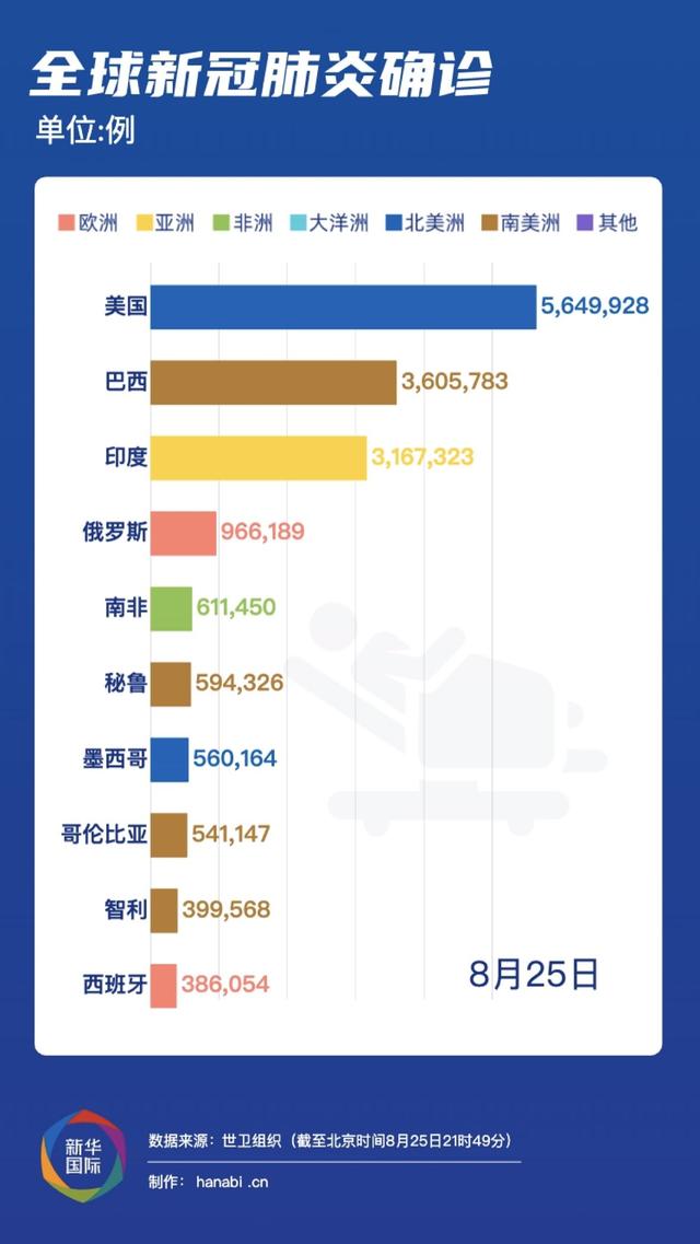 世界卫生组织:截至欧洲中部时间25日15时49分(北京时间21时49分),全球确诊病例较前一日增加206382例,达到23518343例;死亡病例增加4056例,达到810492例。