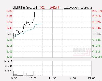 金融界网站4月7日讯 今日维维股份开盘报3.36元,截止10:45分,该股涨10.15%报3.69元,封上涨停板。