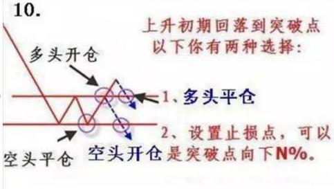10、上升初期回落到突破点一下你有两种选择:1、多头平仓。2、设置止损点,可以是突破点向下N%。