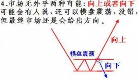 4、市场无外乎两种可能:向上或者向下,可能会有人说,还可以横盘震荡,没错,但最终市场还是会给出方向,此时应静观其变,再做选择。