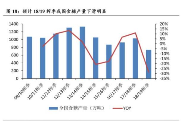 而另一个主产区巴西因为油价上涨因素产量持续下滑,因为巴西甘蔗通常被用于压榨糖和生产乙醇汽油,受国际油价上涨影响,乙醇与汽油比价下降,生产乙醇的利润增加,燃料乙醇需求的增加,促使甘蔗被用于制作乙醇的比例上升,所有在利润的追求上面巴西在18/19榨季糖产量下降了近10%。在国内的供给格局方面,甘蔗收购价持续走低加上走私问题,种植比较效益降低,所有种植意愿不强,
