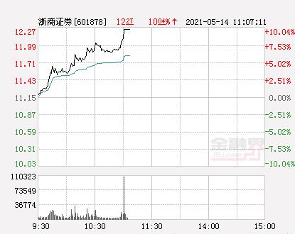 金融界网5月14日消息,今日浙商证券开盘报11.16元,截止11:05分,该股涨10.04%报12.27元,封上涨停板。