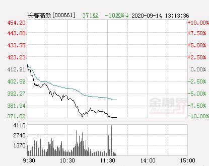 金融界网站9月14日讯 今日长春高新开盘报416.6元,截止13:10分,该股跌10%报371.62元,封上跌停板。
