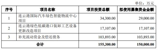 公告显示,连云港本次非公开发行募集资金总额不超过人民币15亿元(含本数),扣除发行费用后的净额将全部分别用于连云港国际汽车绿色智能物流中心项目、连云港绿色低碳港口装卸工艺设备更新改造项目、补充流动资金及偿还债务。