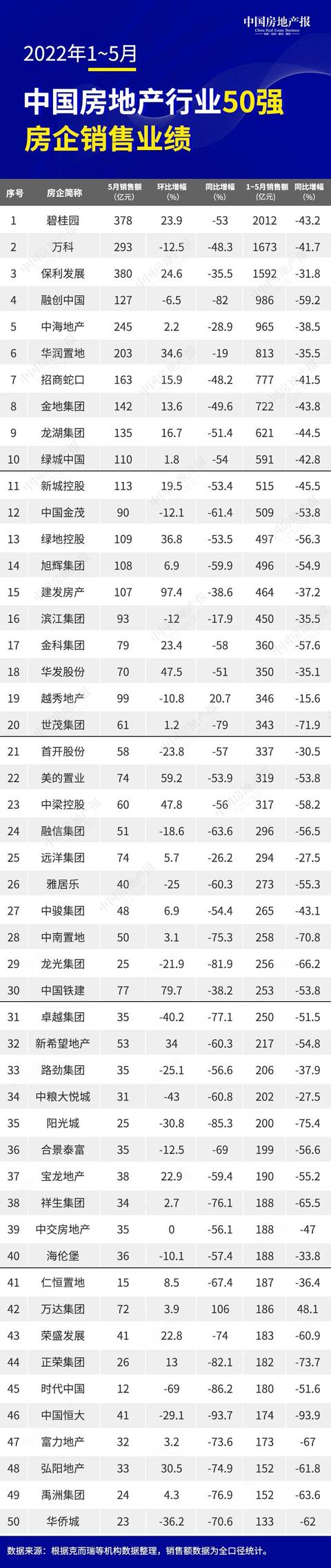 前5个月,销售额超千亿元房企仅碧桂园、万科、保利发展3家,较去年同期减少12家;超百亿元房企有70家,较去年同期减少48家。