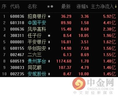 今日主力净流入个股前十:招商银行、中国平安、风华高科、任子行、平安银行、华创阳安、二六三、贵州茅台、同花顺、安妮股份