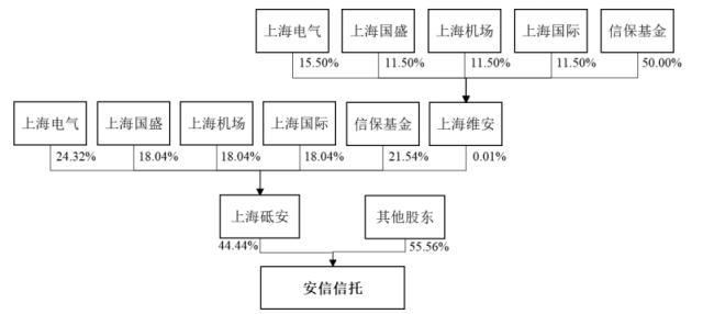 上海砥安的股东上海电气(集团)总公司、上海国盛(集团)有限公司、上海国际集团有限公司、上海机场(集团)有限公司、中国信托业保障基金和上海维安投资管理有限公司通过上海砥安间接持有安信信托股份,非公开完成后公司股权控制关系如下图所示: