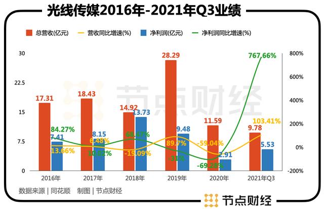 直接看财报数据,2016年至2019年,光线传媒的总营收分别为17.31亿元、18.43亿元、14.92亿元和28.29亿元;归母净利润分别为7.41亿元、8.15亿元、13.73亿元和9.48亿元。