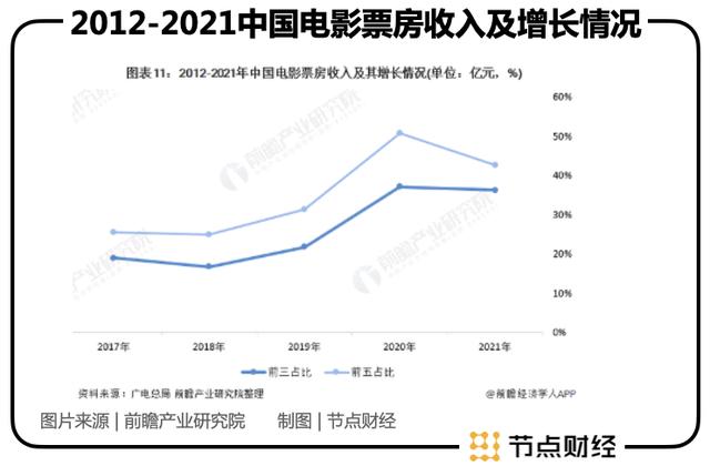 比如2018至2021年,除了2020年比较特殊外,电影票房前三名和前五名的占比不断提升。