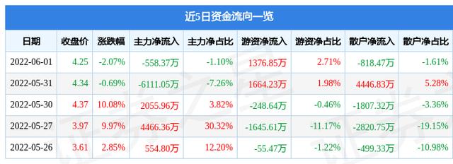 资金流向数据方面,6月1日主力资金净流出558.37万元,游资资金净流入1376.85万元,散户资金净流出818.47万元。