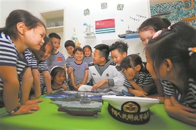 5月25日,在北部战区海军某护卫舰支队开展的“童心向党庆六一”主题活动中,中士王胜林为孩子们讲解舰船知识。 王光杰摄