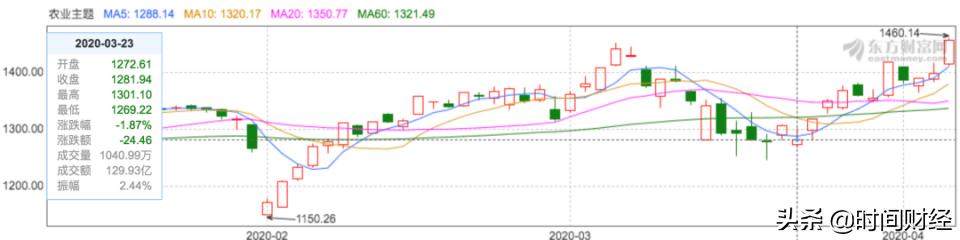 受此影响,A股农业板块近期走强。根据东方财富,农业板块指数从3月23日的1270点增至4月7日的1460点,涨幅近15%,暴涨1.5倍的金健米业更是领跑整个板块。