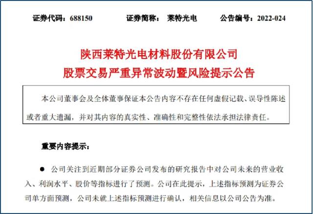 莱特光电表示,“公司关注到近期部分证券公司发布的研究报告中对公司未来的营业收入、利润水平、股价等指标进行了预测”,指标预测为证券公司单方面预测,其未就上述指标预测进行确认。