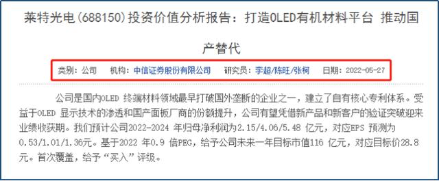 资料显示,最近两个多月,仅有中信证券一家发布了针对莱特光电的研报,而中信证券,也是莱特光电上市之时的保荐券商。