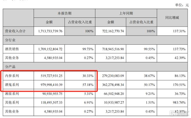 按照数据表现上看,公司主打高端产品线的内参系列、主打次高端产品线的酒鬼系列的业绩表现较为突出。半年报披露的信息显示,两系列的营收分别占到公司营收的30.33%、57.18%。