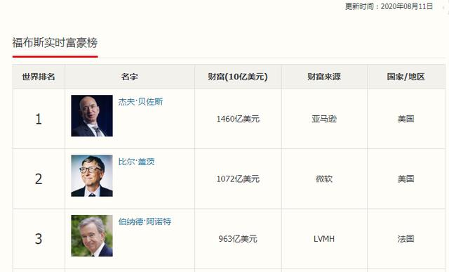 根据福布斯发布的《福布斯实时富豪榜》来看,全球首富依然是杰夫贝佐斯,身家财富达到1460亿美元,按1美元=6.9439人民币来换算的话,其个人财富大概达到了10138亿元;全球排名第二的是比尔盖茨,身家财富达到1072亿美元,也就是7443.86亿元;排名第三的是伯纳德阿诺特,身家财富达到了963亿美元,也就是6686.97亿元。根据该份榜单来看的话,全球身家财富达到6000亿人民币的只有这3个人,可以说他们任何一个人的财富放在中国的话,那妥妥的中国首富。