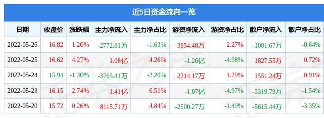 资金流向数据方面,5月26日主力资金净流出2772.81万元,游资资金净流入3854.48万元,散户资金净流出1081.67万元。