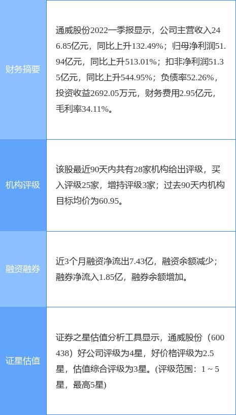 本文摘要:今日通威股份(600438)涨5.31%,收盘报53.53元。2022年4月28日,中国银河研究员周然发布了对通威股份的研报《硅料高景气带来营收利润双丰收》,该研报对通威股份给出“买入”评级。研报中预计2022-2023年营业收入984.1… …