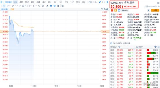 受此重磅消息影响,伊利股份高开逾8%,并一度冲高接近涨停。截止发稿前,暂报30.8元,涨幅为7.62%,最新总市值为1872亿元。