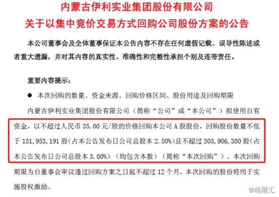 伊利股份回购公告显示,公司拟以自有资金、通过集中竞价的方式回购公司A股股份,回购价格将不超过35元/股,回购股份数量不低于15195.32万股且不超过30390.64万股,约占公司总股本的2.5%-5%,回购股份的实施期限为自董事会审议通过回购方案之日起的12个月之内。