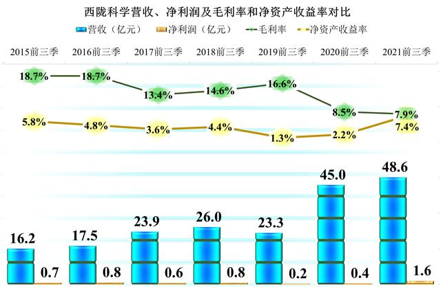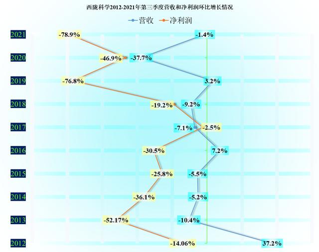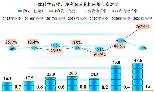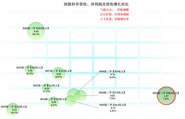 从气泡图来看,西陇科学2021年前三季度的营收创下了历史新高,但增长率却只有7.9%,净利润也是创下了历史新高,气泡位于右下角较好的位置。