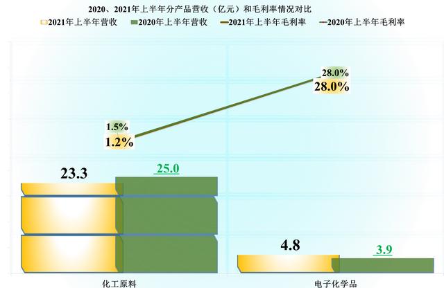 其毛利率下降的主要原因就是占营收比达七成以上的“化工原料”产品的毛利率在1.5%的低位还下降至了1.2%,这已经是微利产品了,幸好还有“电子化学品”以28%的毛利率来稳住了公司整体的毛利率水平。