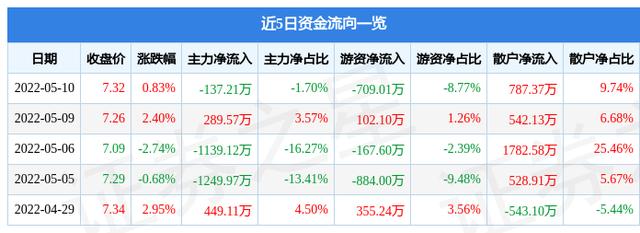资金流向数据方面,5月10日主力资金净流出137.21万元,游资资金净流出709.01万元,散户资金净流入787.37万元。