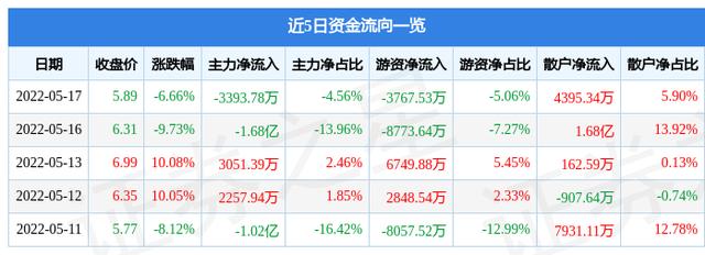 资金流向数据方面,5月17日主力资金净流出3393.78万元,游资资金净流出3767.53万元,散户资金净流入4395.34万元。