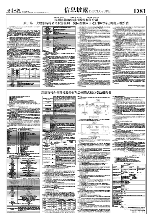 1、深圳市特尔佳科技股份有限公司(以下简称“公司”或“特尔佳”)的第一大股东深圳创通嘉里投资合伙企业(有限合伙)(以下简称“创通嘉里”)通过协议转让方式向其一致行动人深圳市创通投资发展有限公司(以下简称“创通投资”)转让其所持有的特尔佳30,000,913股股份(约占特尔佳总股份的14.5636%)。本次股份协议转让系公司第一大股东及其一致行动人在同一实际控制人之下的股份转让,未导致公司第一大股东的实际控制人发生变更。